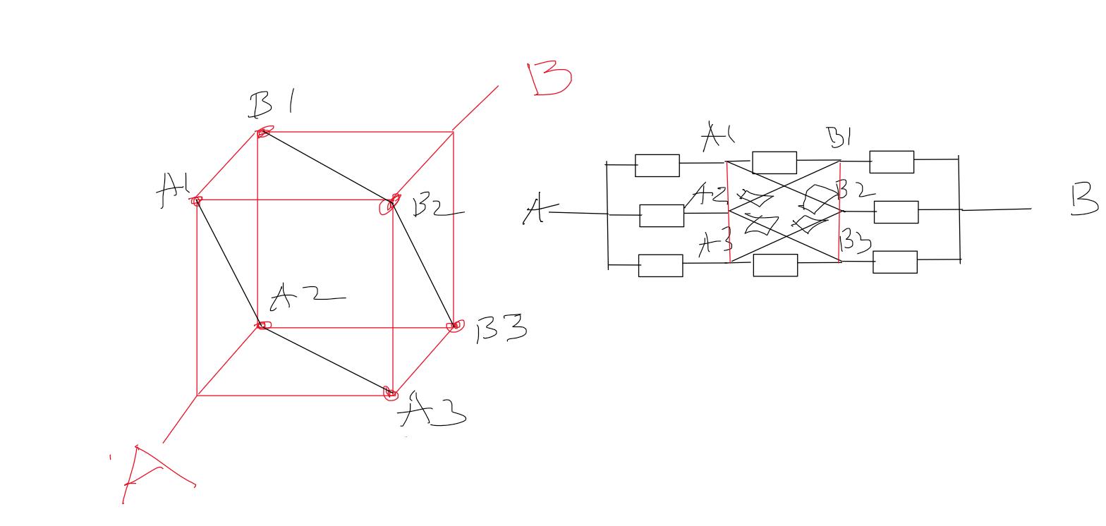 Det man kan se i min figur är att det minsta avståndet från A till B är tre motstånd emellan och det framgår också av kuben,