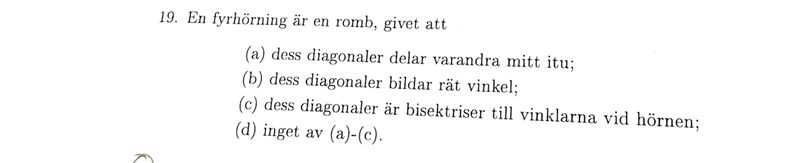 Jag tänker mig en rektangel uppfyller inte b) men sen finns det parallellogram och kvadrat  där parallellogram uppfyller a) men ej de andra alternativ och en kvadrat är jag osäker över om den uppfyller c) för jag tror ej den uppfyller b).  Jag kan ej låta bli att svara d) här eftersom de andra fyrhörningar som då är specialfall av romb fyller ej alltid alla alternativ. Det kanske finns lättare sätt att närma sig denna uppgift än vad jag gjorde