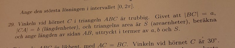 facit får sqrt(a^2+b^2+2sqrt(a^2b^2-4S^2)) medan jag får minus istället. Vad gör jag för fel? Jag använde areasatsen, trigonometriska ettan samt cosinussatsen.