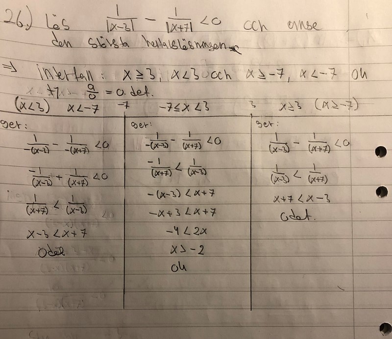 Du multiplicerar med x+7 (positivt) och x-3 (negativt) mellan rad 2 och 3 i mittenspalten.