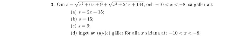 jag skrev s=2x+15 först men eftersom det är rotuttryck så blir det s=|x+3|+|x+12| och -10<x<-8. i a) stämmer det men sträckan kan ej vara negativ om man stoppar in x=-9. b)stämmer ej heller eftersom vi får ett x som ej ingår i den berörda intervallet. I c) tänker jag likadant så jag valde d). Rätt svar är c).
