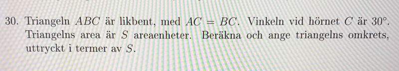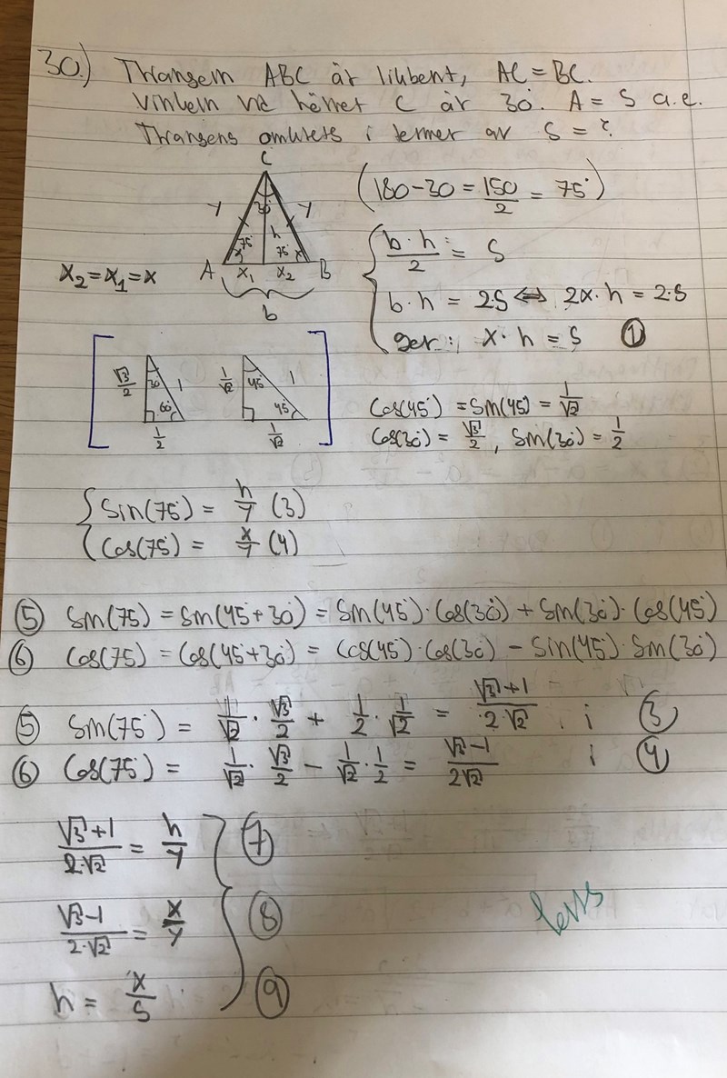 En annan lösningside är att använda areasatsen 2 ggr. Dels med 30 gradersvinkeln och dels med 75 gradersvinkeln.