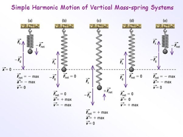 Beloppet av den resulterande kraften är lika i övre och undre vändlägena. Tyngdkraften är konstant till belopp och riktning överallt i rörelsen. Fjäderkraften ökar när fjädern dras ut och är störst i undre vändläget.