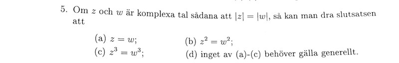Nu vet jag ej om svaret är d) för att alternativen ger oss komplexa tal medan villkoret |w|=|z| är ett reelt tal vilket ej är samma sak som att de två komplexa är lika med varandra