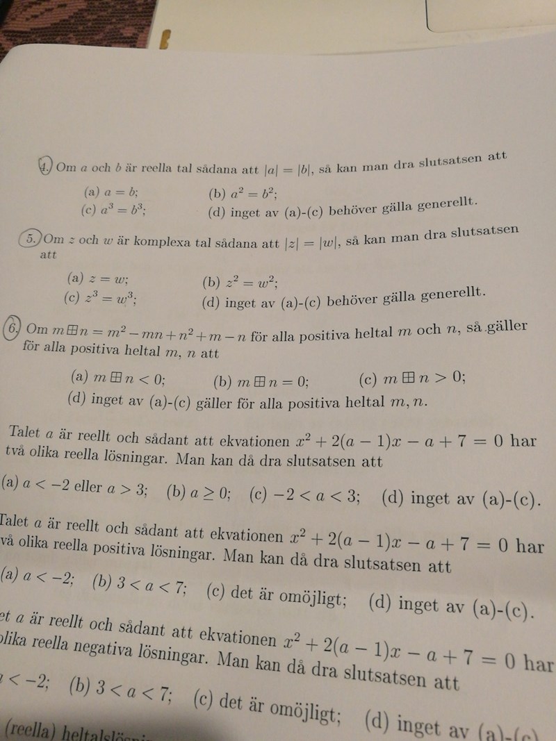 Bedinsis skrev:Ett angreppssätt skulle vara att undersöka vad det blir om m eller n eller båda är 0. Kan man i det resulterande uttrycket få någonting positivt eller negativt finns det svarsalternativ som kan elimineras.