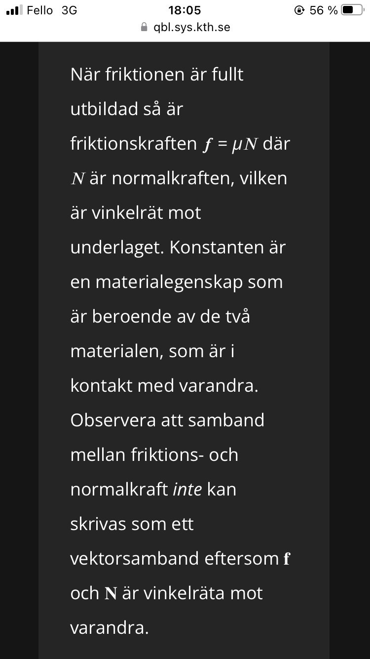 Laguna skrev:Ff är inte vinkelrät mot underlaget, den är parallell med underlaget. Däremot har du en normalkraft också.