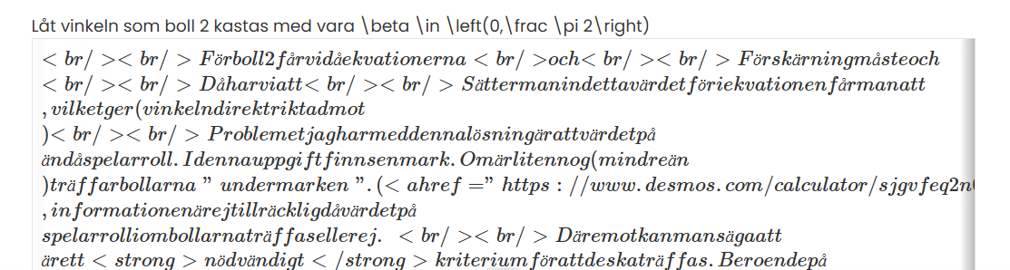 Låt vinkeln som boll 2 kastas med vara \beta \in \left(0,\frac \pi 2\right)<br/><br/>Förboll2fårvidåekvationerna<br/><br /><br />För boll 2 får vi då ekvationerna <br />x_2(t) = v_0t \cos \betaoch och \displaystyle y_2\left(t\right) =1+ v_0 t \sin \beta - \frac{gt^2}2<br/><br/>Förskärningmåste<br /><br />För skärning måste x_1 = x_2och och y_1  = y_2<br/><br/>Då<br /><br />Då x_1 = x_2harviatt har vi att \displaystyle t = \frac{4}{v_0 \cos \beta}<br/><br/>Sättermanindettavärdetför<br /><br />Sätter man in detta värdet för tiekvationen i ekvationen y_1 = y_2fårmanatt får man att 1 = \tan \beta,vilketger, vilket ger \beta = \frac\pi 4(vinkelndirektriktadmot (vinkeln direkt riktad mot \textbf P)<br/><br/>Problemetjagharmeddennalösningärattvärdetpå)<br /><br />Problemet jag har med denna lösning är att värdet på v_0ändåspelarroll.Idennauppgiftfinnsenmark.Om ändå spelar roll. I denna uppgift finns en mark. Om v_0ärlitennog(mindreän är liten nog (mindre än 4 \sqrt{\frac g5})träffarbollarna"undermarken".(<ahref="https://www.desmos.com/calculator/sjgvfeq2n0"target="blank"rel="noopener">Sedennadesmosgraffördemonstration</a>).Dettafickmigförstatttänka) träffar bollarna "under marken". (<a href="https://www.desmos.com/calculator/sjgvfeq2n0" target="_blank" rel="noopener">Se denna desmos graf för demonstration</a>). Detta fick mig först att tänka D,informationenärejtillräckligdåvärdetpå, informationen är ej tillräcklig då värdet på v_0spelarrolliombollarnaträffasellerej. <br/><br/>Däremotkanmansägaatt spelar roll i om bollarna träffas eller ej. <br /><br />Däremot kan man säga att \beta = \frac \pi 4ärett<strong>nödvändigt</strong>kriteriumförattdeskaträffas.Beroendepå är ett <strong>nödvändigt </strong>kriterium för att de ska träffas. Beroende på v_0behöverdeinteträffas,men<em>om</em>deträffarmåste behöver de inte träffas, men <em>om </em>de träffar måste \beta = \frac \pi 4.Eftersomskärning<strong>endast</strong>kanskefördennavinkelär. Eftersom skärning <strong>endast</strong> kan ske för denna vinkel är B$$ rätt svar. Är detta rätt tänkt?