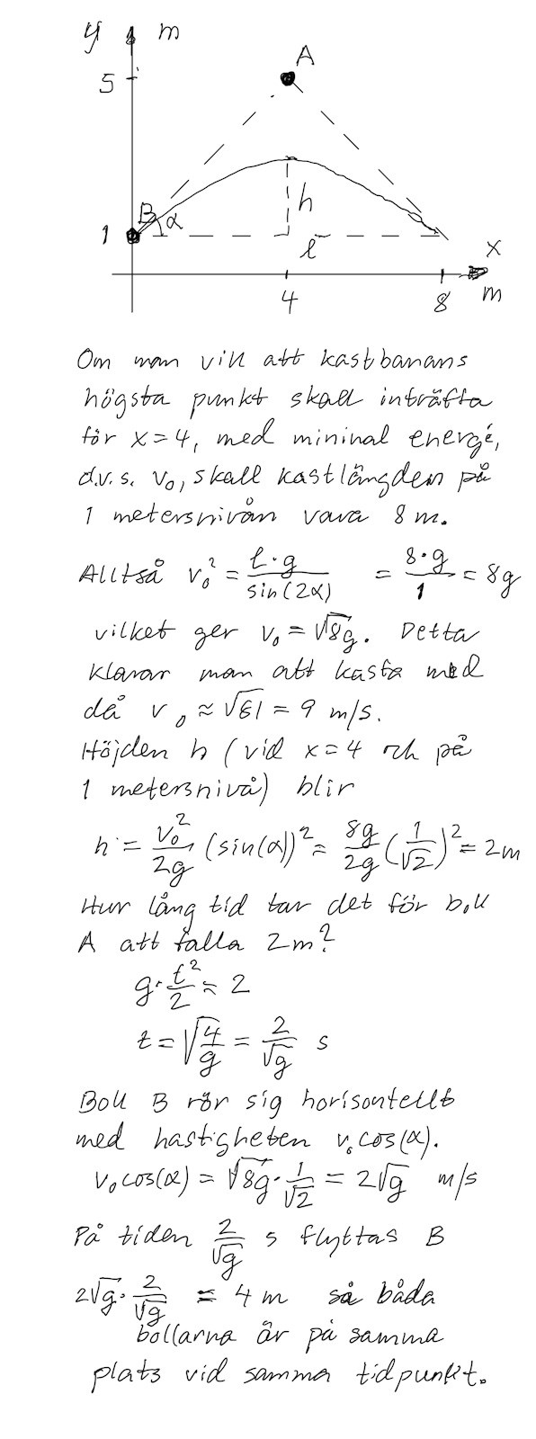 Med vinkeln β = π4 så sker träffen när boll 2 är i sin högsta punkt. Kan det finnas en lösning där kastbanans högsta punkt hamnar innan x=4m? Och i så fall att vinkel blir större?