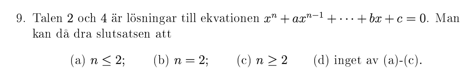 Om 2 och 4 är lösningar är VL (x-2)(x-4)p(x) där p(x) är "som minst" en konstant varför n≥2.