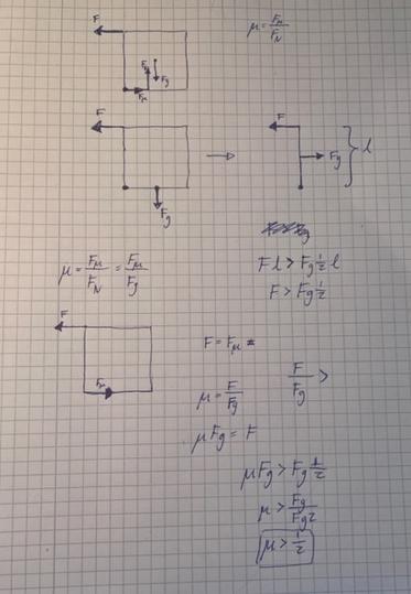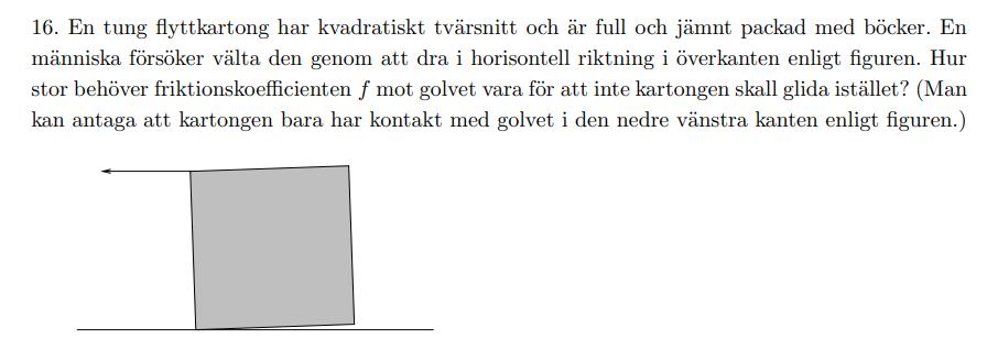 Tänker om man fixerar vänstra hörnet. För att kartongen ska välta till vänster måste väl . För jag kommer sedan fram till att men facit säger .