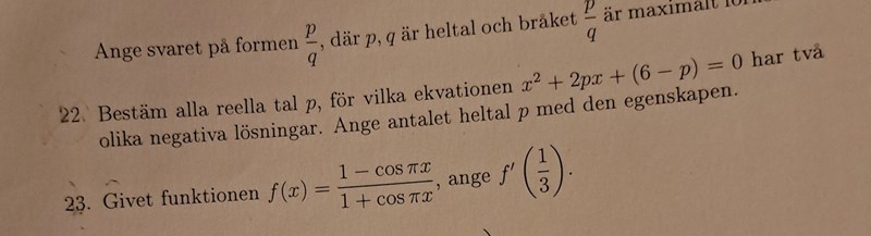 Jag undrar varför jag ej kan hitta dessa "heltallösningar" som facit räknat ihop till. Jag fick att när p>2 så får vi två negativa olika lösningar förutom då p=6. Jag provade med fall 1) då p<-3 och det gav mig ej riktigt de där två olika negativa lösningar medan i fall 2) då p>2 så får jag det. Dock vet jag ej om jag borde ha hållit mig mellan 2<p<6 då p=6 ger två olika lösningar med olika tecken