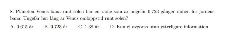 Hejsan! Är det någon som har löst uppgift 8 på fysikdelen av MaFy 2021? Den om Venus omloppstid?