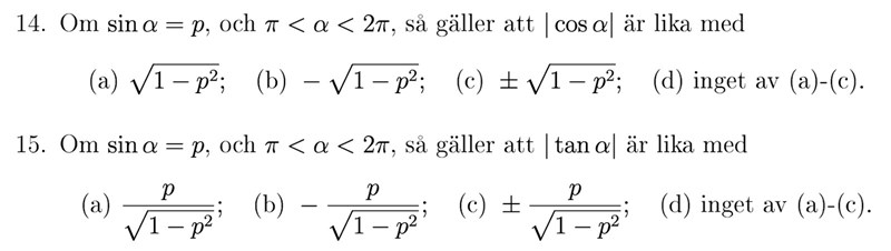 Svaret på fråga 15 är faktiskt positivt eftersom både och är positiva (-(-y)) där p = -y, och y är sinusvärdet. Så även om kan vara negativ i fjärde kvadranten, så är dess absolutvärde alltid positivt, vilket innebär att svar A inte är korrekt.