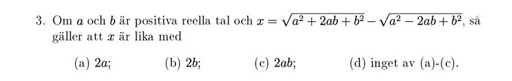 Men om du ska lösa fullständigt här måste du komma ihåg att bara gäller om x≥0. Om x<0 gäller i stället . Till exempel är Det betyder att om b > a så kommer a - b att vara negativt och då gäller inte . I stället måste du dela upp fallen och analysera b≤a och b > a var och en för sig, och då kommer du att se att inget av alternativen a, b eller c stämmer.