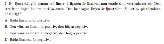 Baguesses skrev:Ja jo men vad säger det om dess egenskaper. Svaret är B och jag antog att om den andra linsen hade varit negativ så hade ljuset brutits uppåt istället för nedåt.