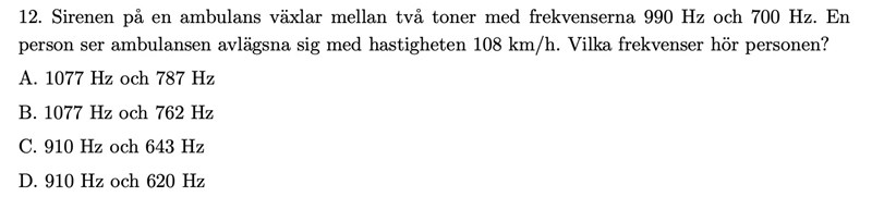 Alternativ C och D ger lägre frekvenser, vilket är korrekt för en ljudkälla som avlägsnar sig från en observatör. Men eftersom frekvensen av ljudet beror på ambulansens hastighet och ljudets hastighet, så behöver vi bestämma den faktiska hastigheten av ljudet som rör sig genom luften. Då ljudets hastighet i luften är ungefär , och ambulansen rör sig bort från observatören vid en hastighet av , kommer dopplereffekten att sänka frekvensen på den högre tonen till ungefär , och den lägre tonen till ungefär . Därför är alternativ C det korrekta svaret och alternativ D är felaktigt.