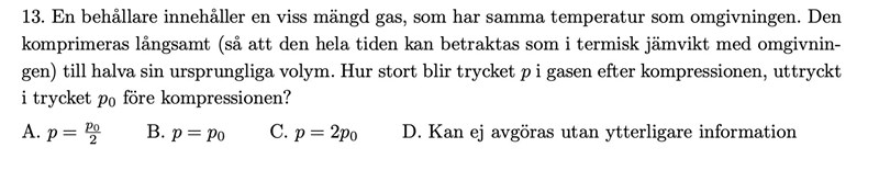 För att lösa uppgiften, skulle man kunna använda sig av Boyles lag? Som bekant säger den att trycket och volymen för en gas är omvänt proportionella när temperaturen är konstant. Vi vet att gasen är i termisk jämvikt med omgivningen under hela kompressionen, vilket innebär att temperaturen förblir konstant.