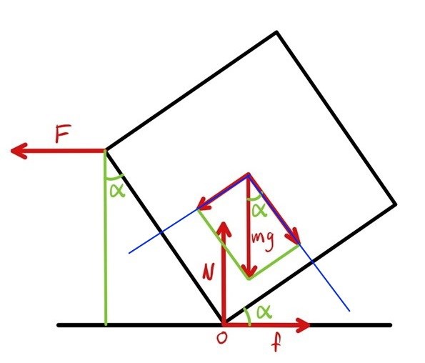 Man kan ser det geometriskt: den gröna linjen är hälften av den svarta linjen. Och längden av den är längden av den lila linjen (acosα)(a \cos \alpha) minus den orangea linjen (asinαa \sin \alpha). Så det ger att förhållandet mellan den gröna linjen och den lila linjen är  Fmg=12cosα-sinαcosα=(1-tanα)/2\frac{F}{mg} = \frac{1}{2} \frac{\cos \alpha - \sin \alpha}{\cos \alpha} = (1-\tan \alpha)/2.