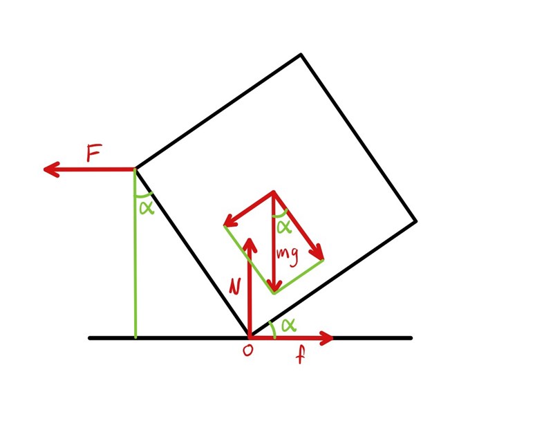 -Facos(α)-a2mgsin(α)+a2mgcos(α)=0\displaystyle -Fa\cos(\alpha)-\frac{a}{2}mg\sin(\alpha)+\frac{a}{2}mg\cos(\alpha)=0