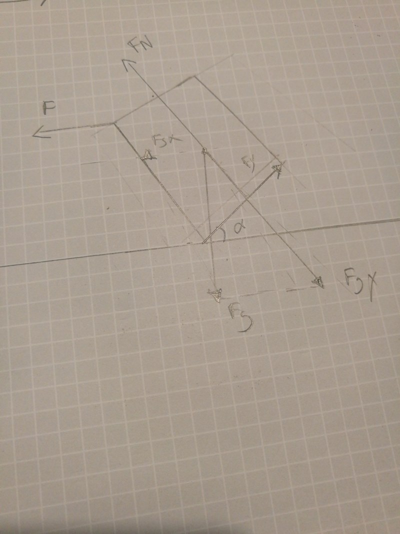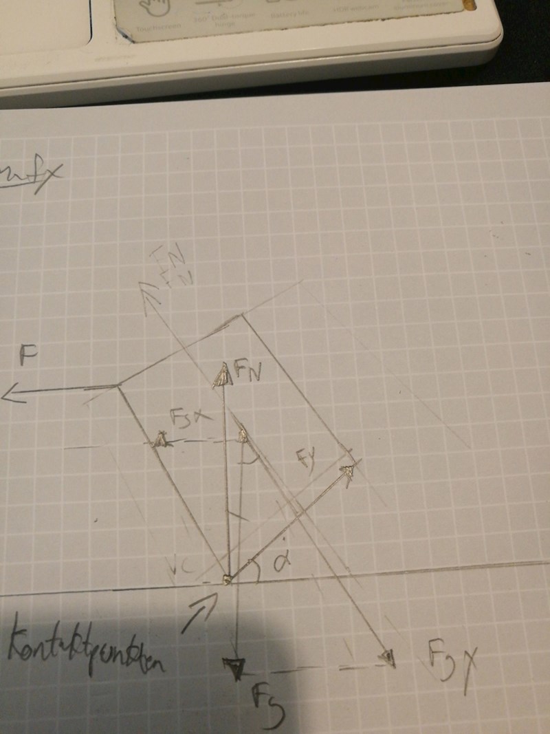 Jag har kommit på tyngdkraften, tyngdkraftens komposanter i x och y led samt friktionskraften. Sen ritade jag även ut normalkraften. Men enligt smaragdalena är riktningen fel och jag förstår ej riktigt varför.  Vad tråkigt att FN  ej heller bidrar till moment, varför gör den ej det?  Nu vet jag ej om stödpunkten är där jag i min tidigare bild kallar för kontaktpunkten, men jag antar att den ska ha krafter i y och x led.