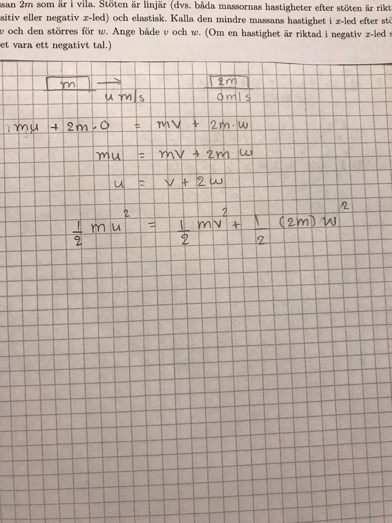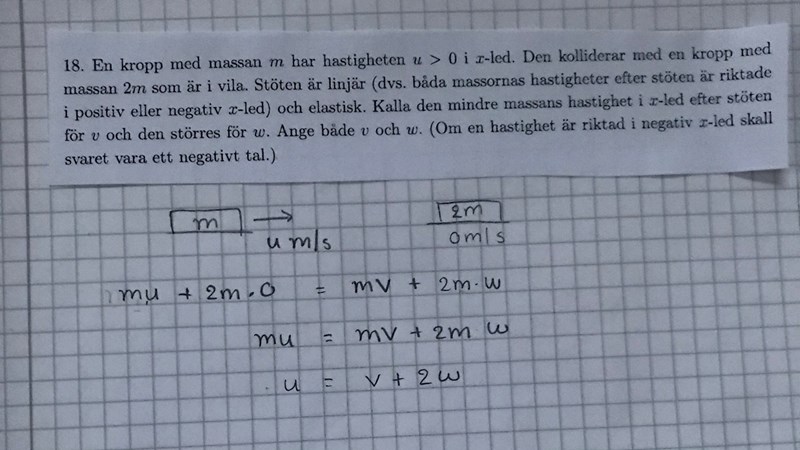 Du måste använda dig av att stöten är elastisk. Det innebär att energin i stöten är bevarad, lika mycket kinetisk energi före som efter stöten. Kan du ställa upp en ekvation som visar det?