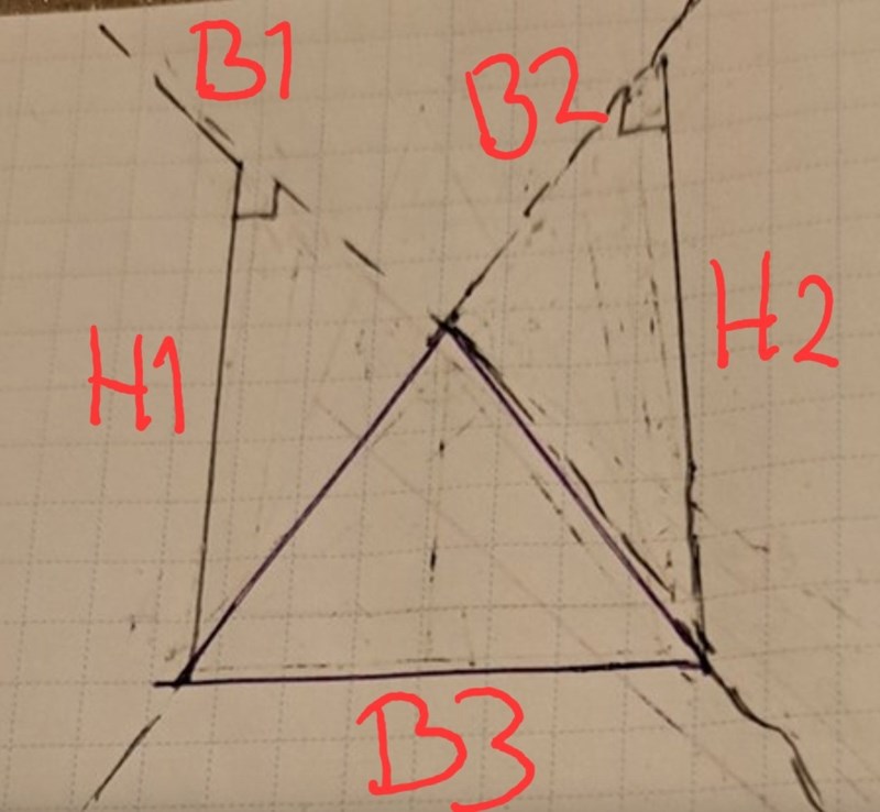 Yngve skrev:Se bild, jag kallar höjderna för H1 och H2 samt triangelsidorna (ich de förlängda sidorna) för B1, B2 och B3.