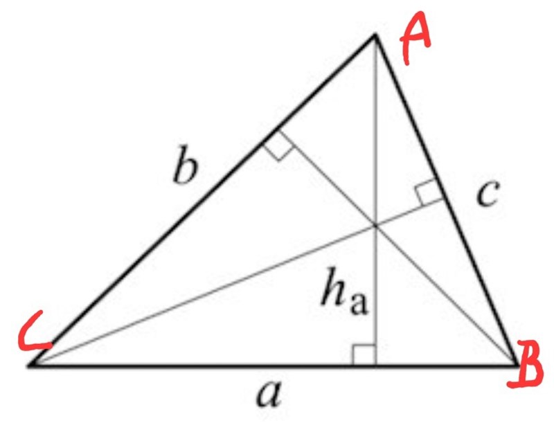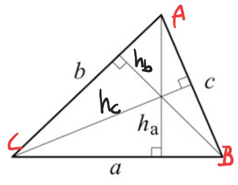 - hc är en normal till sidan c och går till det mot c motstående hörnet C. Alltså är hc en höjd I triangeln.