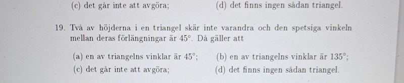 Okej så för att besvara uppgiftens fråga. Vi ser att höjderna ej skär varandra. I texten säger de att vinkeln mellan förlängningarna är 45 grader. Vi ser även att två st tringlar är likformiga.
