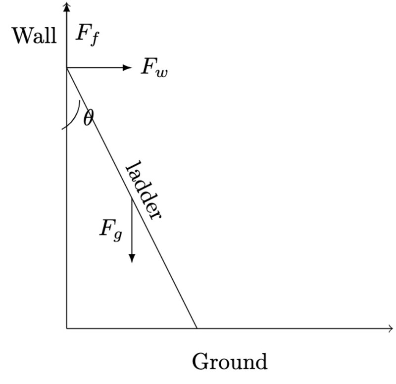 Fg är från stegens masscentrum. Om stegen glider, skulle den glida ner längs väggen. Friktionskraften motverkar alltid rörelsen, därför kommer den, Ff, att riktas vertikalt uppåt längs väggen. Kontaktkraft på stege från vägg är Fw.