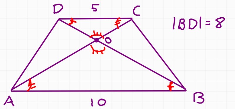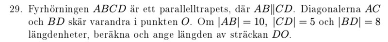 29. Fyrhörningen ABCDABCD är ett parallelltrapets, där ABCDAB \parallel CD. Diagonalerna ACA C och BDB D skär varandra i punkten OO. Om |AB|=10,|CD|=5|A B|=10,|C D|=5 och |BD|=8|B D|=8 längdenheter, beräkna och ange längden av sträckan DOD O.