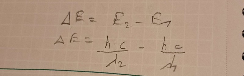 Jag har försökt lösa uppgiften genom att använda formeln , där står för energi, är Plancks konstant och är frekvensen. Jag omvandlade sedan våglängderna till frekvenser genom att använda formeln , där är ljusets hastighet. Därefter beräknade jag skillnaden mellan energierna för de två tillstånden genom att subtrahera dem från varandra.