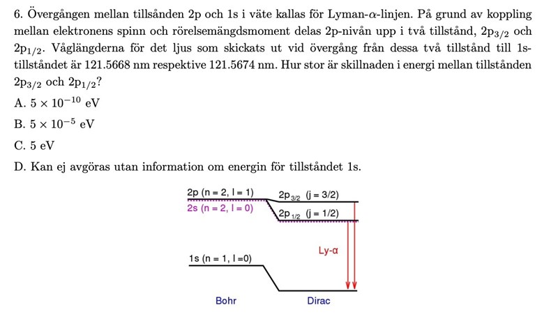 Övergången mellan tillstånden och 1s i väte kallas för Lyman--linjen. På grund av kopplingen mellan elektronens spinn och rörelsemängdsmoment delas nivån upp i två tillstånd, och . Våglängderna för det ljus som skickas ut vid övergång från dessa två tillstånd till tillståndet är respektive . Hur stor är skillnaden i energi mellan tillstånden och ?
