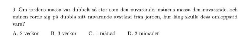 "Om jordens massa var dubbelt så stor som den nuvarande, månens massa den nuvarande, och månen rörde sig på dubbla sitt nuvarande avstånd från jorden, hur lång skulle dess omloppstid vara?"