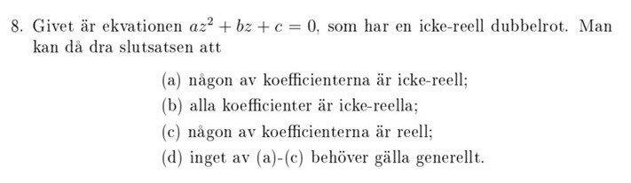 Vi ser att det finns möjligheter att alla koefficienter är icke-rella, därför går alternativ c) bort. "Det är det svårt att se tycker jag. Kan man verkligen lyckas med det?"