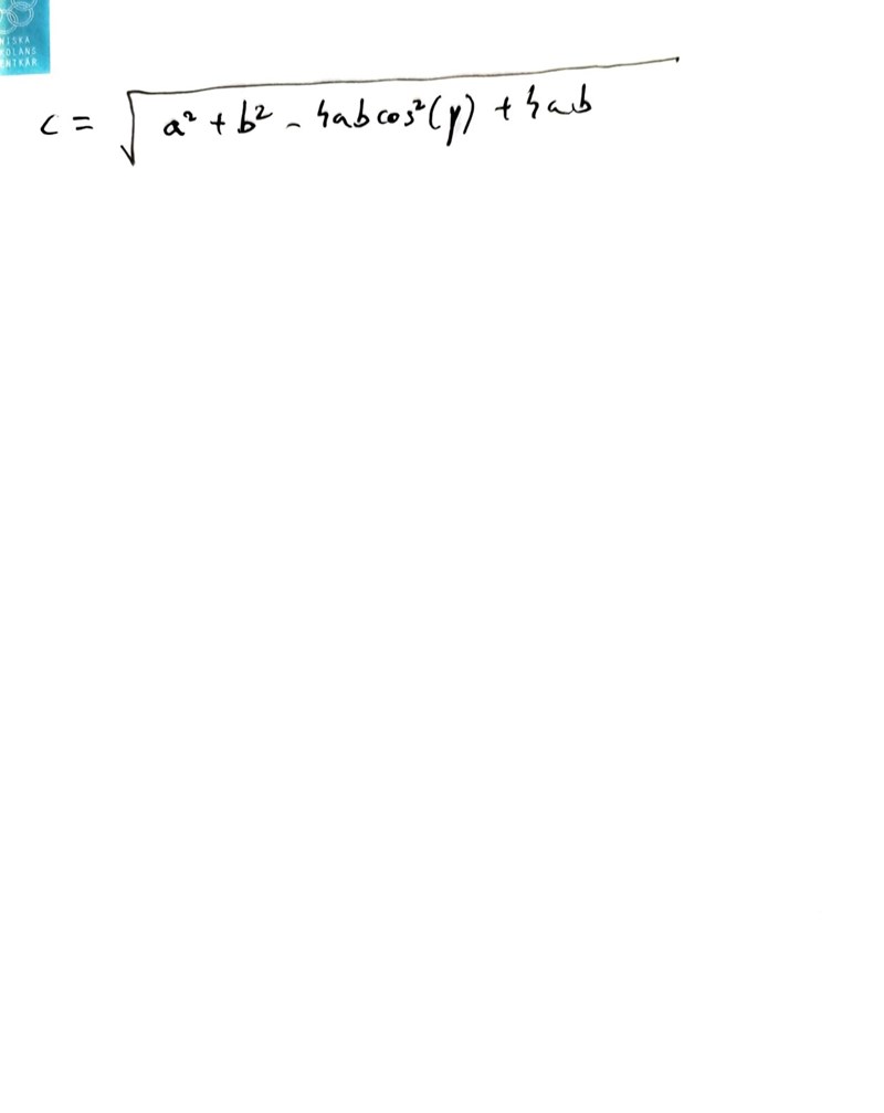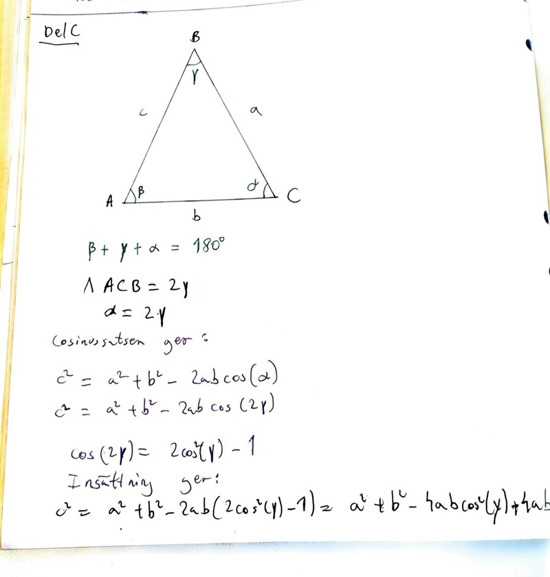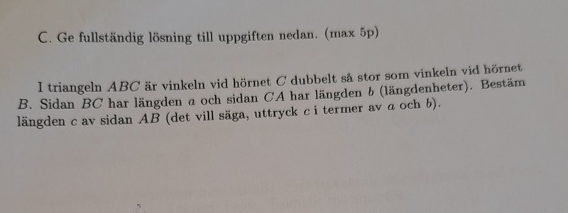 Jag löste den på det sättet men tyvärr kom jag ej på hur jag ska få bort cos uttrycket under roten ur för att bara ha termer av a och b. Antar att jag borde ha använt mig av tex sinussatsen eller något?