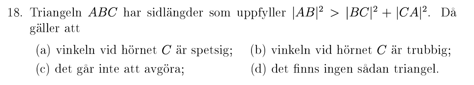 LuMa07 skrev:Det är snarare cosinussatsen som hjälper till att avgöra om vinkeln vid hörnet C är spetsig eller trubbig.