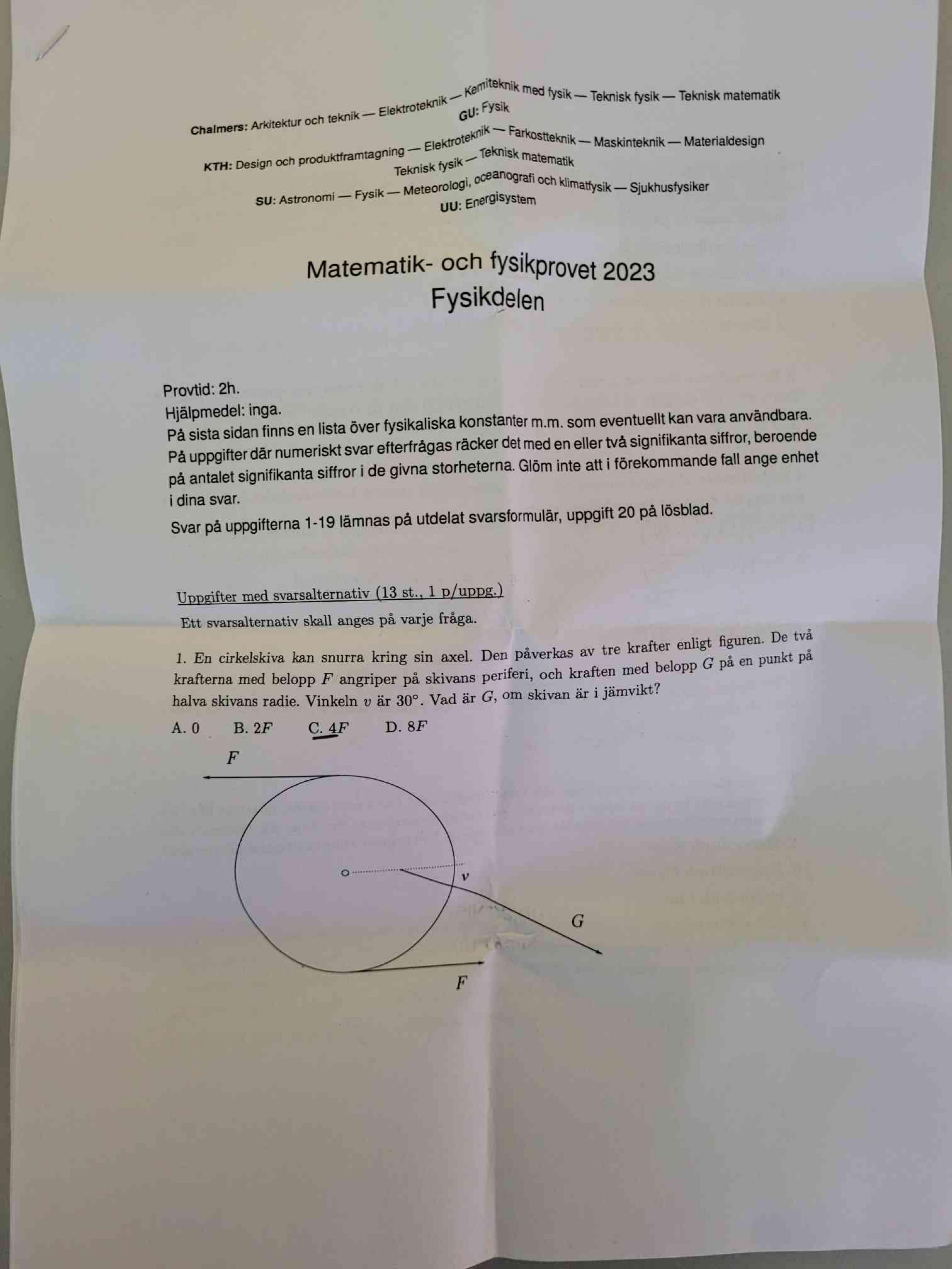 1. En cirkelskiva kan snurra kring sin axel. Den påverkas av tre krafter enligt figuren. De tva krafterna med belopp angriper på skivans periferi, och kraften med belopp på en punkt på halva skivans radie. Vinkeln är . Vad är , om skivan är i jämvikt?