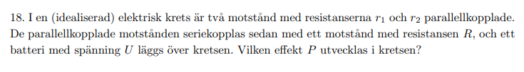 såhär ställde jag upp uppgiften. U är given, alltså behövs ersättningsresistansen för hela kretsen, , för att räkna ut i. med u och i får man sedan att p = u * i.