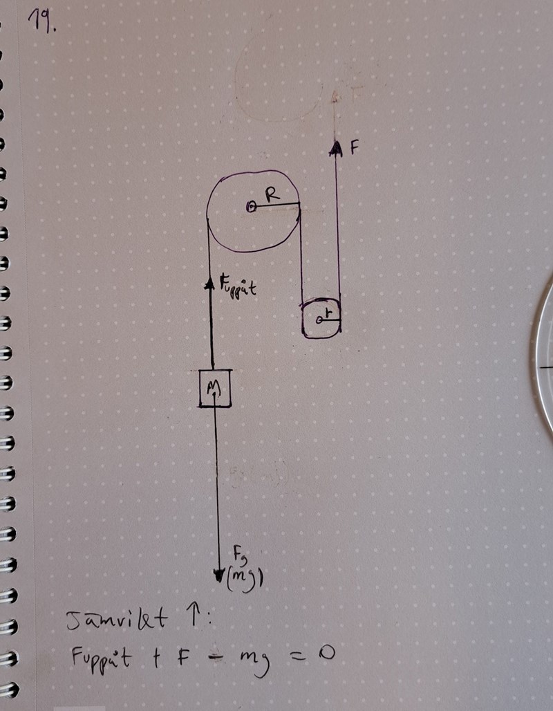 Ja och den måste väl F+Fuppåt=mg som jag ritade? För om man tar bort trissan så kommer bara mg verka på vikten.