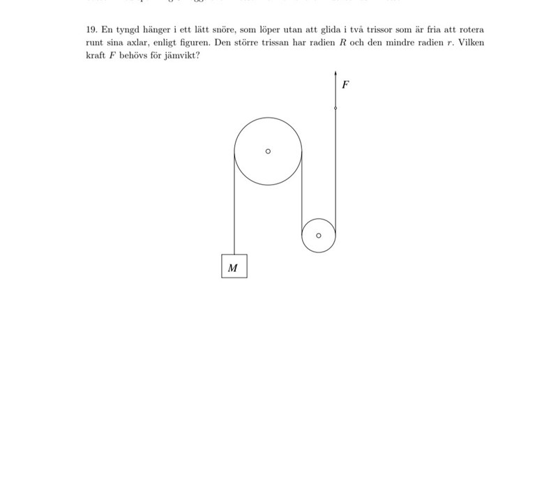 Antar att vi ska ställa upp två kraftmoment med tanke på de olika radie?Problemet handlar om jämvikt. Trissorna roterar inte, snöret accelererar inte.