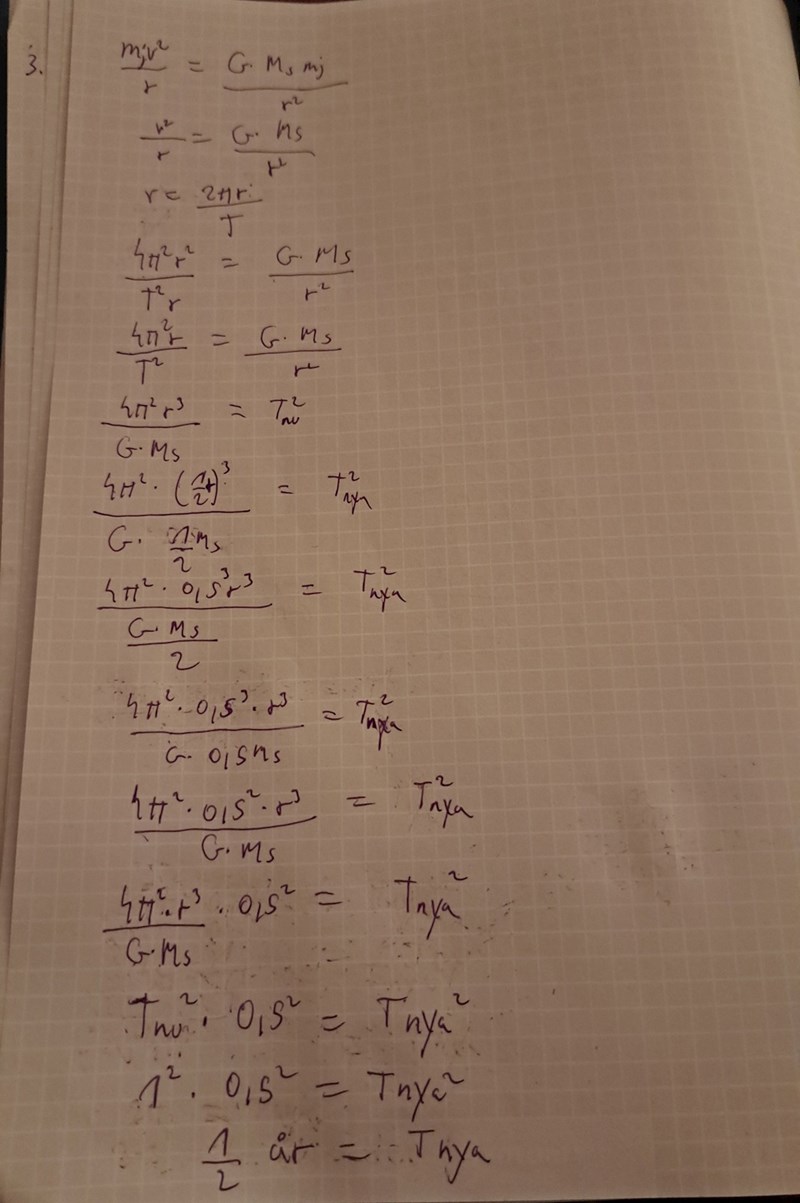 Ah okej funkar sambandet jag editerade också? Sen undrar jag också om det är alltid jordens dragningskraft tillsammans med centripetalkraft som används vid såna typfrågor? Jag tänker ofta på kepslers tredje lag när jag ser såna frågor speciellt när jag skriver på tid o är lite stressad.