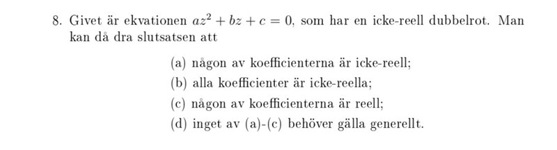 Men hur vet man att c) kan vara både icke reell och reell. Hur ser man det?? Punkt 2 säger du att när a är icke reell så kan både b och c vara vilket som, du menar b och c kan vara reella eller ena är reell och andra är icke reell?