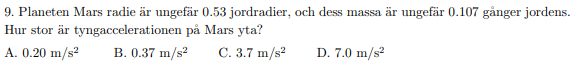 Fattar inte hur rätt svar ska vara D. jag får det till C själv genom att använda Newtons gravitationslag, Gm1m2r2. Om m1 anses vara 1 kg, eftersom den är såpass lite jämfört med m2, och man sätter in massan för mars i m2 och mars-radien i r^2 får man ju 3,7. Vad har jag gjort för fel?