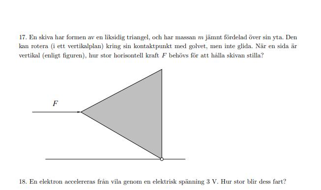Jag tänker att vi endast har två relevanta kraft, mg och F. Vi använder momentlagen. Vi komposant delar mg (som ligger vid mittpunkten av triangeln). Men probelmet är att jag inte vet hur jag ska behandla dessa vinklar då jag inte hittar ett sätt att använda triangel vinklarna för att komposant uppdela då man kan inte med säkerhet säga att de är kongruenta trianglar. Hur ska man göra? Vad gör jag för fel eller vad har jag missat?