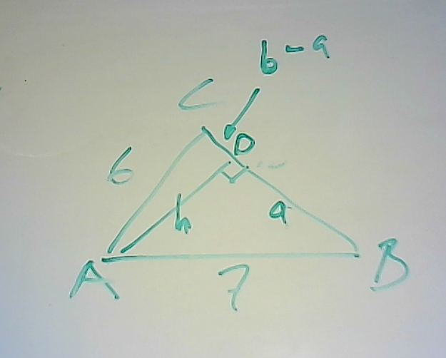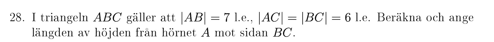 Arean av triangeln kan då räknas ut som x*(AB/2)= x*3,5. Pythagoras sats ger även att x2+3,52 = 62. Från detta får vi att