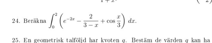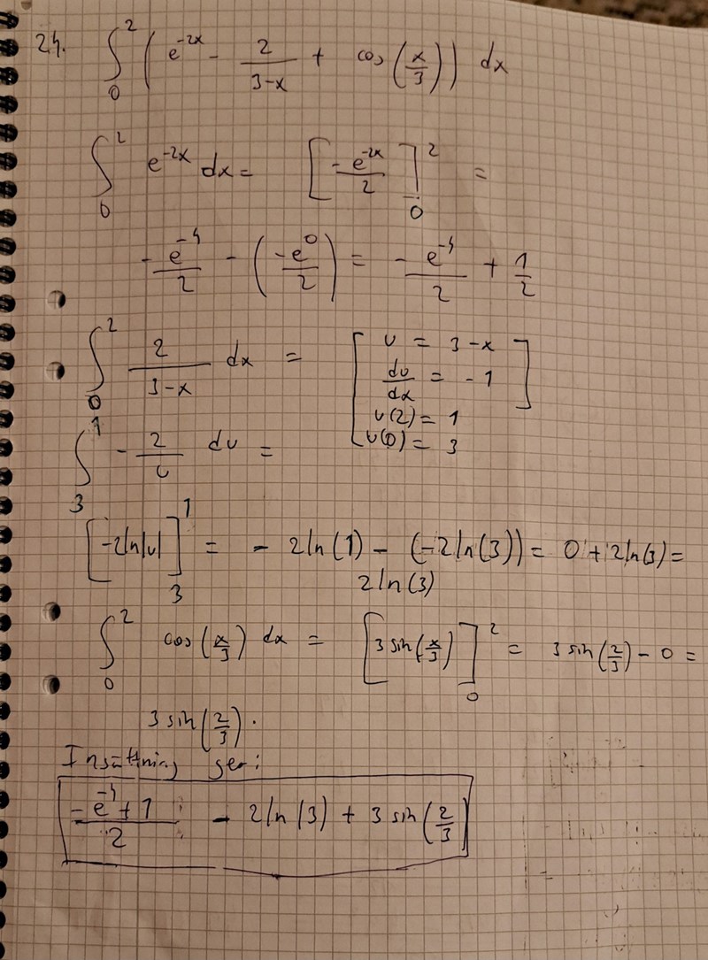 Jag körde något som heter variabelsubstitution och det blev tydligen rätt nu. Men om vi ej har nya gränser som jag hade förut i #5 så blir det istället såhär. Jag räknar med de givna gränserna istället. Sen i svaret blir det ju som facit skrev dvs -2ln(3)