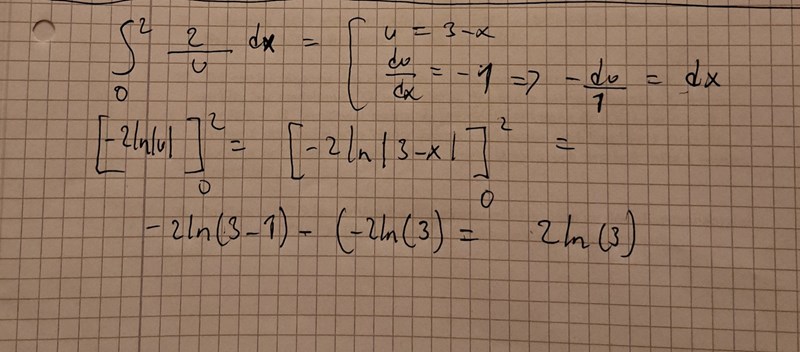 Minustecknet framför 2/(3-x)? Det stämmer att jag ej tog med den. Nu får jag dock samma svar som facit när jag gjorde såhär. Jag tror jag missade att byta plats på de nya gränserna eftersom då x=2 är u(2)=1 och då x=0 där u(0)=3 mha substitution.