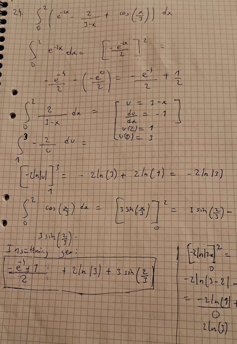 Mrpotatohead skrev:Jag vet inte om det råkat bli rätt eller att du faktiskt gjort. Men om din integral från 0 till 2 (2/(3-x)) dx blir 2*ln(3) eller att integralen från 0 till 2 (-1/(3-x)) dx blir -2*ln(3) (som du verkar gjort nu) så har du nog gjort rätt. Det gäller bara att inte tappa bort minustecken.