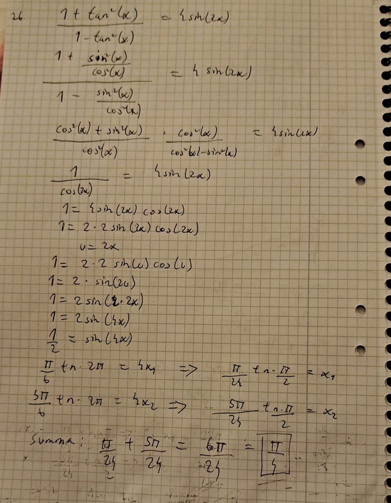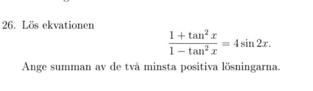 Jag tar formlerna fritt ur minnet så det kan kanske bli fel, men så här: förläng VL med cos2x så får vi VL= (cos2 x+ sin2x) /(cos2x-sin2x)=1/(cos2x-sin2x)= 1/cos(2x) Vi multiplicerar ekvationen med cos(2x) och får ekv. 1=4cos(2x)sin(2x) som ger 1=2sin(4x) Härifrån bör du kunna fortsätta. Jag har alltså använt formeln för dubbla vinkeln först för cos och sist för sin.