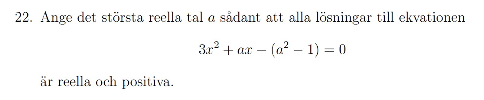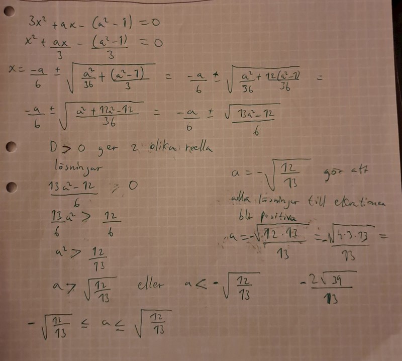 jag kommer inte längre än att jag får att a±1213 genom att sätta så att diskriminanten ska vara större än 0 för att få reella lösningar, och då förkastar jag den positiva lösningen eftersom -a6 ska bli positivt. Men jag förstår inte hur man kommer fram till svaret som är -23913.